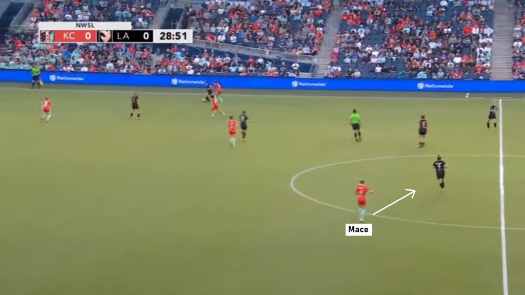 Kansas City also use switches from right to left. Having built possession on the right, the centre-back will play cross-field to Mace on the other flank. Rather than moving right to left patiently with several passes, KC look to find Mace directly with one ball. This reduces the opponent’s time to shift across, creating more situations where Mace has space to attack or is 1-v-1 against a defender. Mace is highly effective here: a powerful runner combining speed and strength, she can burst past the opponent on the outside or drive infield to shoot or play the killer ball. She can single-handedly take the team from ‘building’ to ‘attacking’.