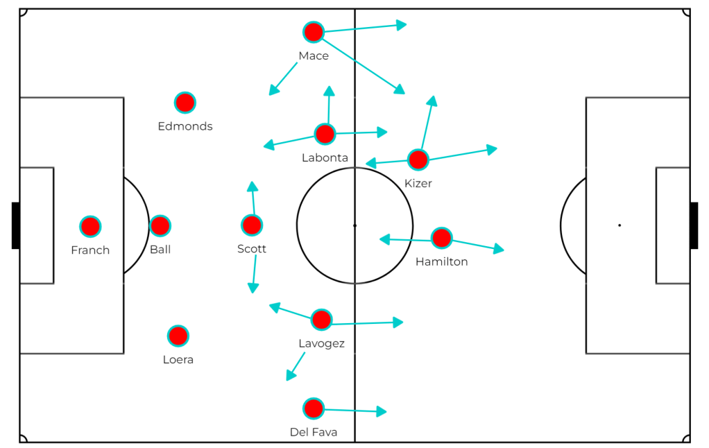 Another pattern is: the first pass goes out to the wing, and the second pass is played behind the opponent for a forward to run onto. LaBonta reacts well to space opening up and makes some dangerous runs from deep when the ball is with the wing-back on the touchline. With the opponent’s centre-backs focusing on Hamilton and Kizer, and their full-backs closing down Mace/Del Fava, LaBonta’s runs test their marking structure, and she can get in behind un-tracked.