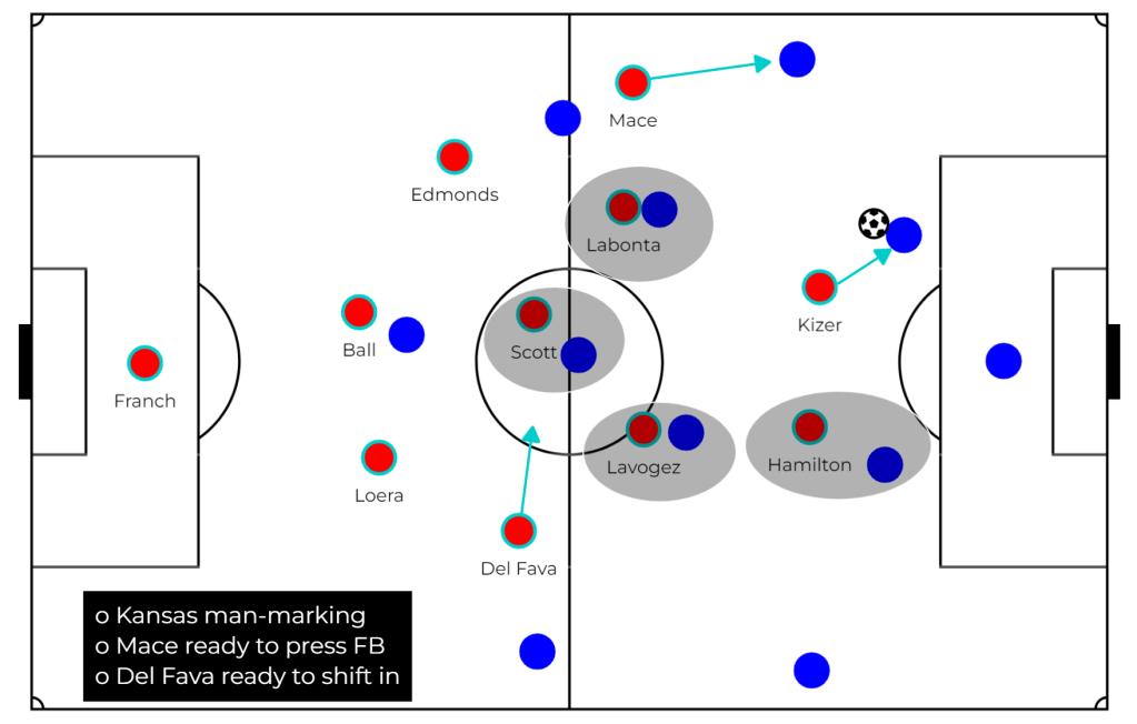 - Flexible man-marking in midfield. This is used in every game, often to disrupt the opponent’s short passing or force turnovers high up the field. This forces a lot of long balls from the opponent, and feeds into the chaotic, end-to-end feeling in most Kansas City games. (They seem to enjoy this chaos more than their opponents, who tend to want a more controlled, organised game.)