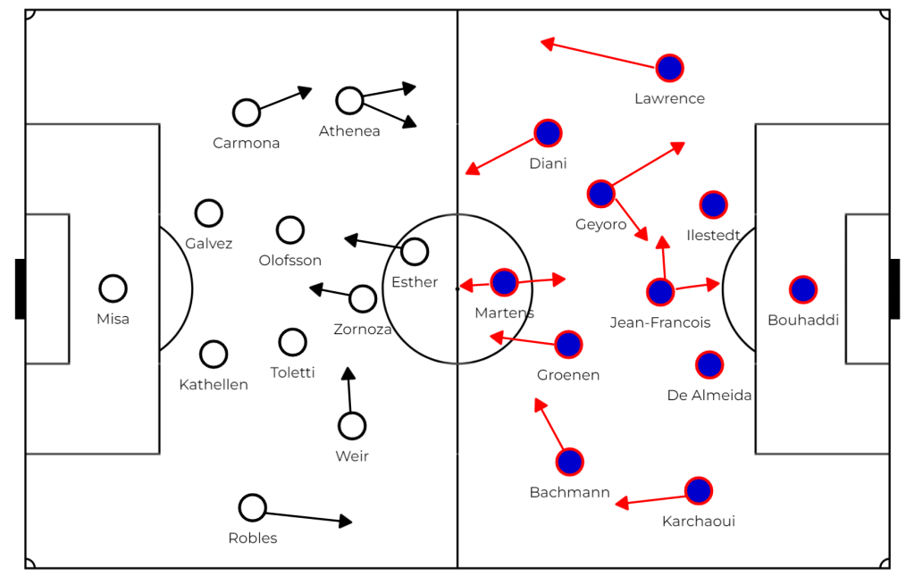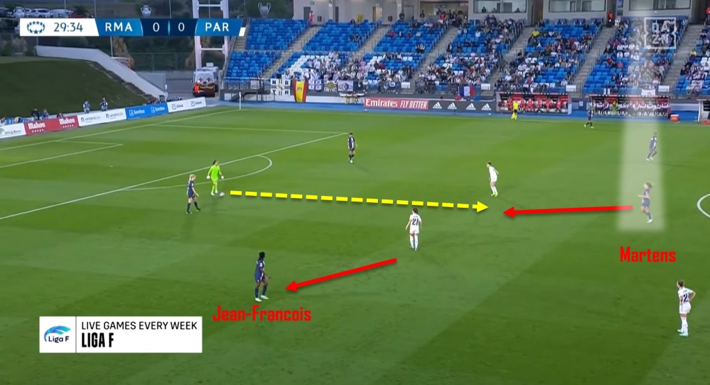 Jean-Francois started there, but often vacated to drop between the centre-backs and make a 3-v-2 to stretch Real’s frontline apart and create more angles into midfield. Sometimes Geyoro would show up in the 6 area, and sometimes she would pull out to the side of Ilestedt in the right-back space. At one point, Martens dropped all the way back from the frontline to receive out from the centre-backs in the 6 area. As you can see, Real’s front two were not prepared, with Zornoza naturally drawn towards Jean-Francois creating a gap between her and Esther to play out of.