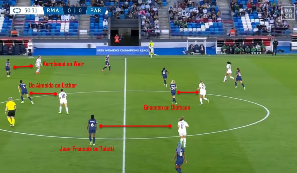 Whereas Real defended in a zonal 4-4-2, PSG employed man-marking in central midfield. With Jean-Francois behind Geyoro and Groenen, they were able to match up and mark Zornoza, Olofsson and Toletti, limiting their time on the ball.
