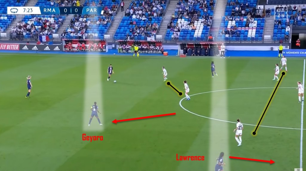 - Real Madrid must find a way to get pressure on Geyoro when she drops into the right-back spot, to eliminate their rotation on that side and prevent Lawrence from creating a 2-v-1 with Diani on Carmona.