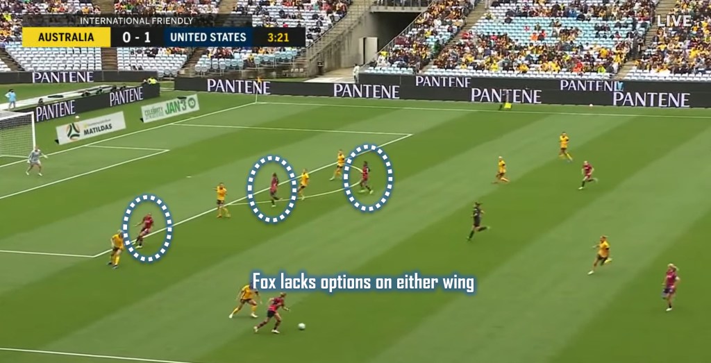 Furthermore, without wingers to combine with, it’s impossible for the fullbacks to work combinations on either flank. Below we see an example from the friendly win over Australia last year. Emily Fox receives on the left flank, but the left winger is inside, not available to combine with. Having then cut back, Fox finds no option for the switch of play, because the right winger is also narrow. There is no width to enable combinations or switches of play.
