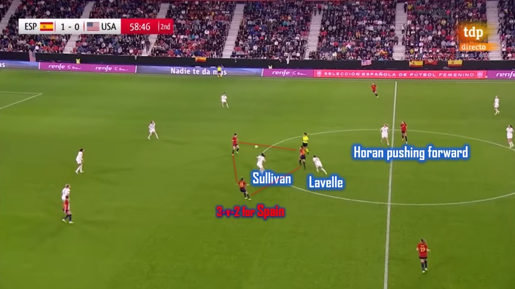 The breakdown at 58 minutes and 45 seconds was an example: Horan gambled on her defensive position, looking to push forward. This left Sullivan and Rose Lavelle in a 2-v-3 situation after the long ball. Spain picked up the second ball, then ran directly at the US back line. Sullivan scrambled to avert the initial danger, but Spain maintained possession and the US were out of shape.
