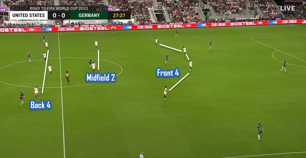 And here’s an example from the first friendly against Germany more recently. Again, there’s a big gap between Sauerbrunn, in possession, and her forward options.