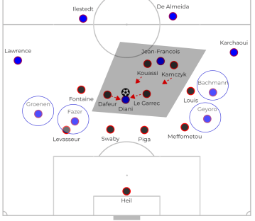 However, while Precheur’s side were able to circulate from one side to the other, they found it difficult to move forward through the middle. Despite having a narrow front three looking for space in-between, the centre-backs couldn’t find them because of Fleury’s compact midfield four. Whenever Diani and Bachmann did receive the ball, Fleury converged on them—a ‘pressing trap’, ‘doubling up’ or whatever you want to call it. The midfielders would converge, and even Kouassi and Kamczyk were ready to help back and reduce the options.