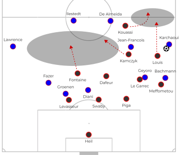 Adding to the risk, if Jean-Francois did come all the way across to help, that meant vacating the centre, leaving huge space for Fleury to counter-attack through. With Lawrence and Karchaoui on the flanks, PSG would effectively have just two players behind the ball in these moments. Against a side with a lightning quick dribbler in Kouassi, with good support from Louis, Fontaine and Kamczyk all ready to burst forward in transition, that’s trouble.