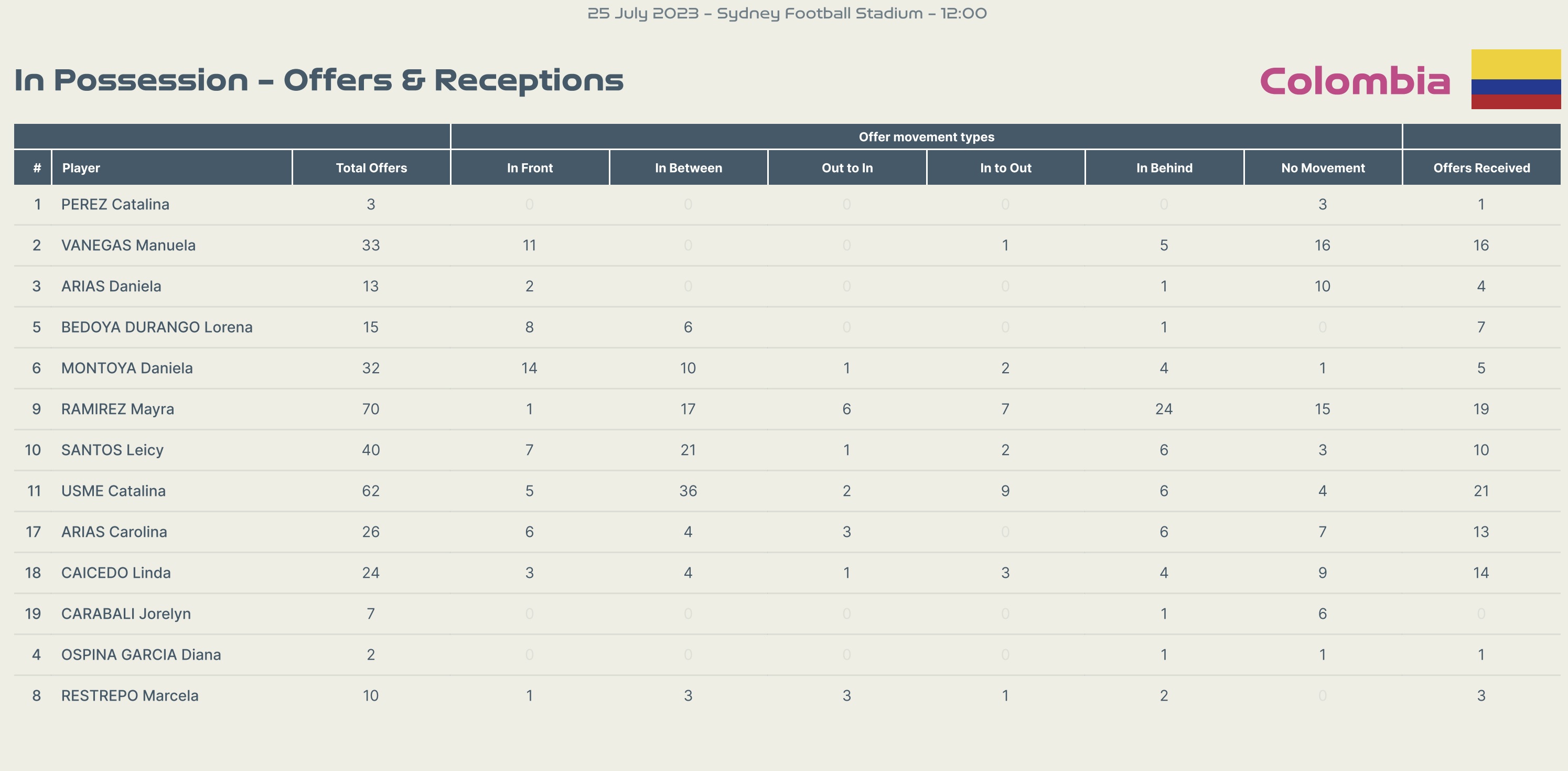 Usme offered more between the lines than anyone else, with 36 offers. Santos was closest to her, making 21 offers in between. Ramirez made 24 offers behind the defence, which is the most by quite some distance in that category. She also offered more ‘out to in’ (presumably when she was coming in from the left flank). Caicedo made fewer offers for the ball than anyone else in the front four, which underlines her role was to stay wide so her teammates could try to find her isolated one-v-one.