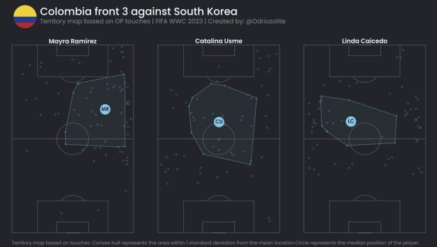 And below is a territory map courtesy of Yash Thakur which shows the fluidity of Colombia’s three ‘forwards’: Ramirez, Caicedo and Usme. As you can see, they all got plenty of touches across the field against South Korea. This graphic backs up the eye test, showing that Usme took a lot of touches in more withdrawn areas, Ramirez was the most involved in the penalty box, and Caicedo’s involvement came mostly on the wings.