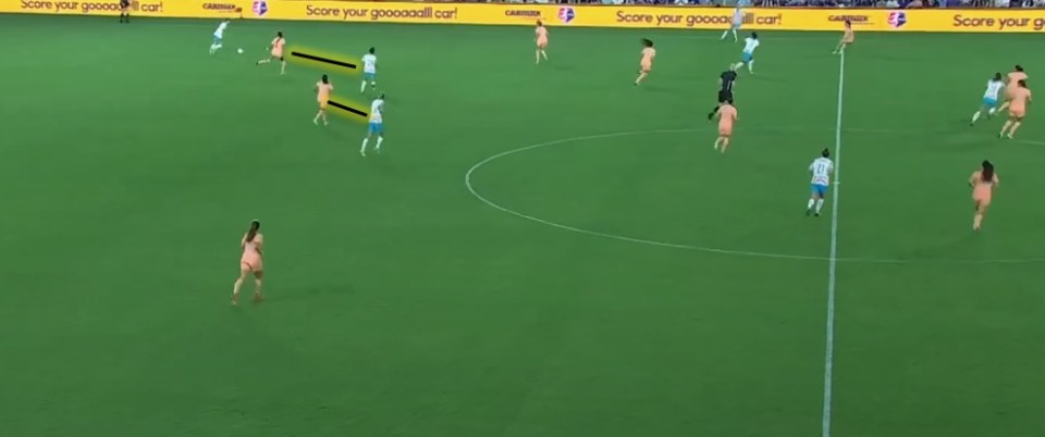 Relatively longer-distance back-passes to the goalkeeper are invitations for the front two to press up. Using the time it takes for the ball to go from one player to another, Orlando try to get closer and rush their opposition. These opportunities don’t always exist, of course. Teams like Angel City and San Diego build-up with their goalkeeper in an advanced position, so back-passes are shorter and offer less time to press up. Then there are the Chicago Red Stars, who go long more often and therefore don’t ‘trigger’ any kind of pressing in those moments.