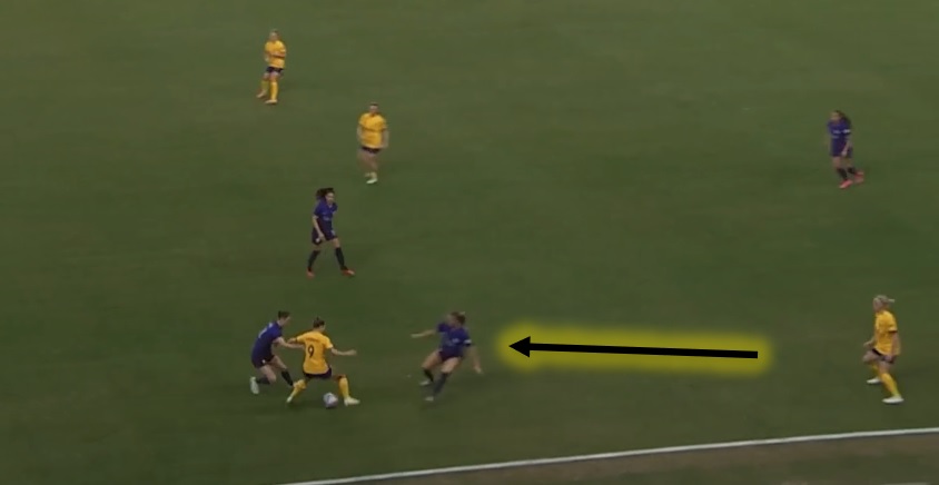 Orlando’s wingers can also instigate pressing in a couple of different situations. These moments are rarer and dependent on the decision-making of the individuals. Julie Doyle and Angelina have created a few turnovers with their reading of the situation and speed to close down.
