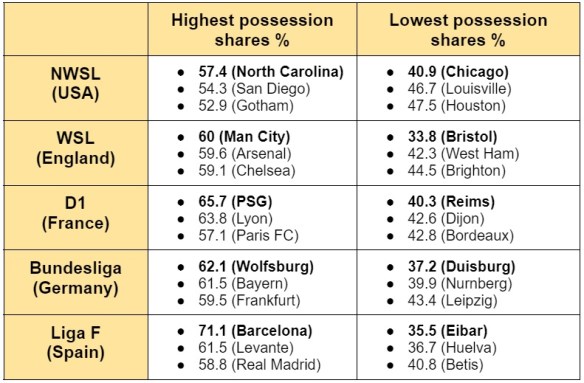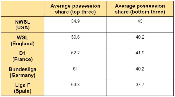 The following numbers back up the idea that the USWNT—many of whom play in the NWSL—are not as used to the low block, and consequent attacking dominance—at club level. These are the three highest and three lowest possession shares in the NWSL compared to Europe’s major leagues.